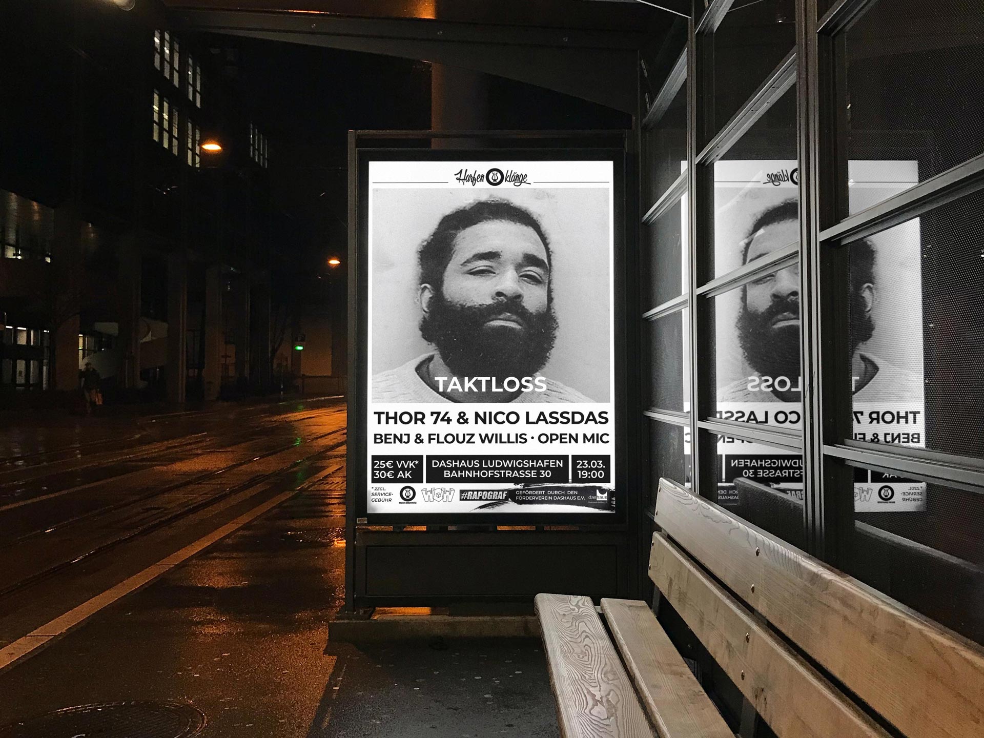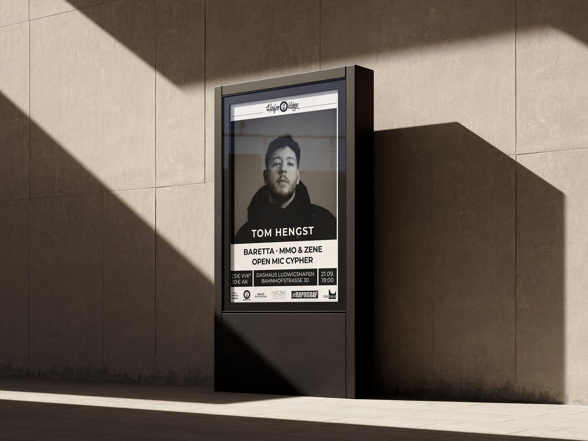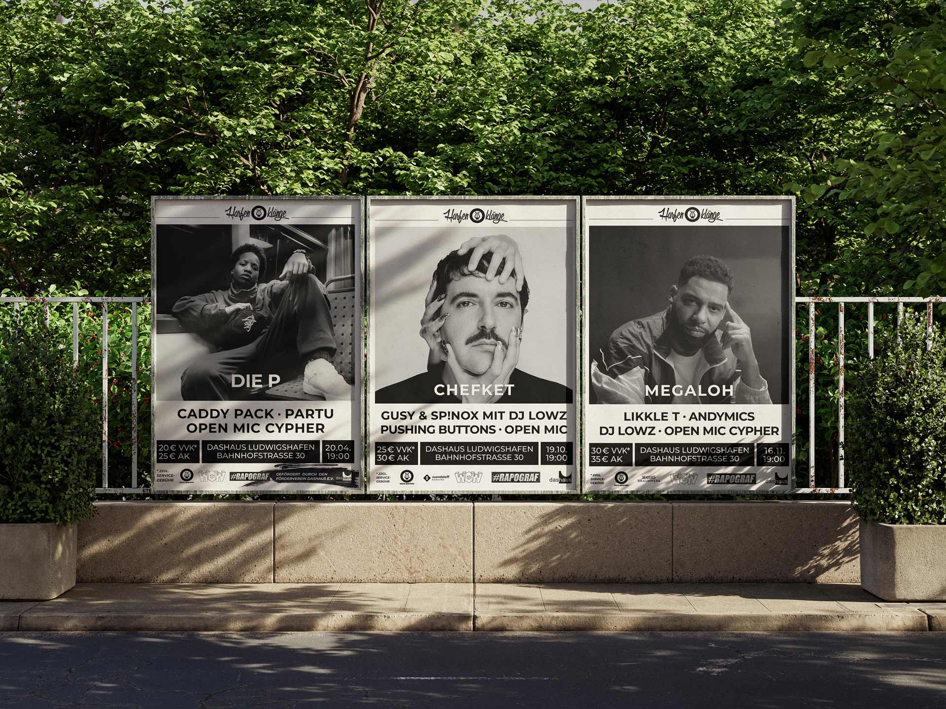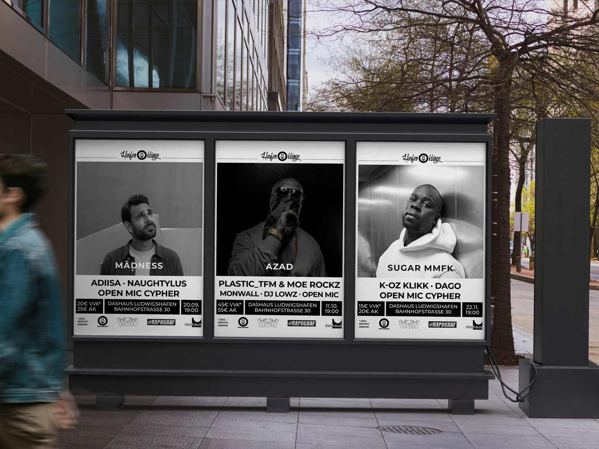 Die monatliche RapJam ‚Harfenklänge‘ im Kulturzentrum dasHaus in Ludwigshafen ist ein zentraler Treffpunkt der regionalen Hip-Hop-Szene. Veranstaltet von den Music Gourmétz, findet sie jeden dritten Samstag im Monat statt und bringt etablierte Künstler sowie Newcomer auf die Bühne. Das Event bietet Live-Shows, offene Mic-Sessions und ist bekannt dafür, eine Plattform für den Austausch und die Vernetzung von Künstler*innen und Fans zu sein. Zu den Gästen zählten bereits Größen wie Morlockk Dilemma, Chefket, Megaloh, Afrob oder Azad, was die Bedeutung der Jam unterstreicht. Für Harfenklänge übernehmen wir sämtliche Corporate-Identity-Aufgaben und gestalten die Werbemittel.